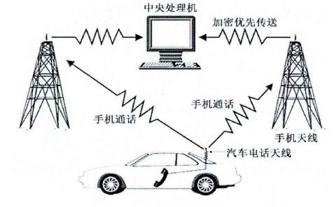 基于移动电话的FCD实现交通信息采集:由于现在手机的广泛使用,每个驾驶员都配备至少一个手机,使用手机作为匿名交通探头就变得更加方便。手机定位通常通过三角或者以其他方法(如交接)将采集到的信息定期传送到网络,然后传播时间和相关数据被转换成有用的信息传送给交通运输中心。交通运输中心对收到的信息进行处理,再发送给每个驾驶员。由于天线较低,这个方法特别适合于提供较为准确的市区交通信息。可以比常规探测器花更少的钱但提供更大范围的信息采集能力。具有投资小,信息量大、采集范围广的特点。图2为移动电话进行通信的示意图。